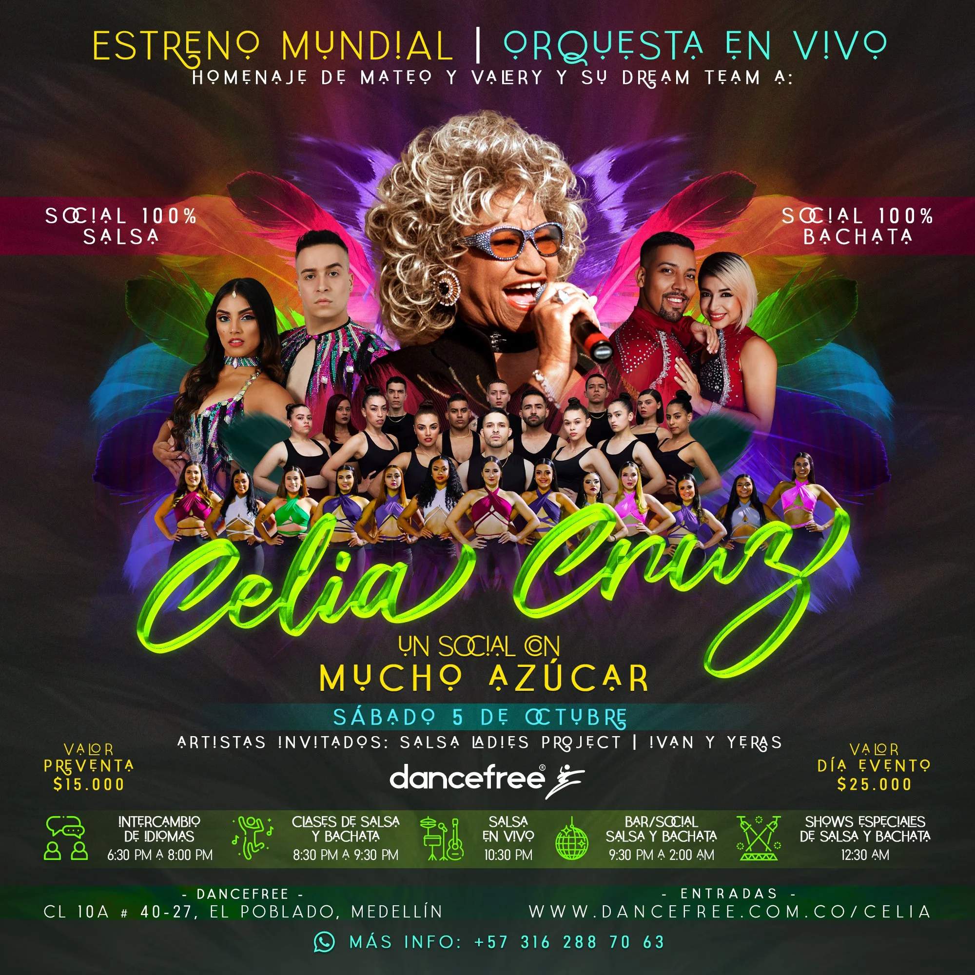 “No te pierdas este evento especial el sábado, 5 de octubre, que incluye intercambio de idiomas de 6:30-8pm, 2 clases simultáneas de salsa (nivel abierto) y bachata (nivel intermedio) de 8:30-9:30pm, social de 9:30pm-2am con 2 ambientes (100% salsa y 100% bachata), salsa en vivo a las 10:30pm y shows especiales de salsa y bachata a las 12:30am.”